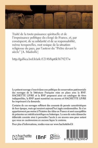 Traité de la toute-puissance spirituelle et de l'impuissance politique du clergé de France, et, par conséquent, de sa solidarité et de sa responsabilité, même temporelles, mot unique de la situation religieuse du pays, par l'auteur du "Prêtre devant le siècle" [A. Madrolle] Date de l'édition originale: 1845 Le présent ouvrage s'inscrit dans une politique de conservation patrimoniale des ouvrages de la littérature Française mise en place avec la BNF. HACHETTE LIVRE et la BNF proposent ainsi un catalogue de titres indisponibles, la BNF ayant numérisé ces oeuvres et HACHETTE LIVRE les imprimant à la demande. Certains de ces ouvrages reflètent des courants de pensée caractéristiques de leur époque, mais qui seraient aujourd'hui jugés condamnables. Ils n'en appartiennent pas moins à l'histoire des idées en France et sont susceptibles de présenter un intérêt scientifique ou historique. Le sens de notre démarche éditoriale consiste ainsi à permettre l'accès à ces oeuvres sans pour autant que nous en cautionnions en aucune façon le contenu. Pour plus d'informations, rendez-vous sur www.hachettebnf.fr