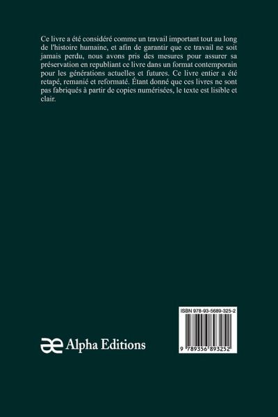 Traité des eunuques, a été reconnu comme une ¿uvre majeure dans toute l'histoire humaine, et nous avons pris des précautions pour assurer sa préservation en rééditant ce livre de manière moderne pour les générations présentes et futures. Ce livre a été entièrement retapé, révisé et reformaté. Le texte est lisible et clair car ces livres ne sont pas créés à partir de copies numérisées.