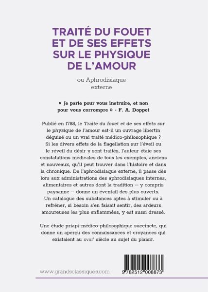 « Je parle pour vous instruire, et non pour vous corrompre » - F. A. Doppet POUR UN PUBLIC AVERTI. Publié en 1788, le Traité du fouet et de ses effets sur le physique de l'amour est-il un ouvrage libertin déguisé ou un vrai traité médico-philosophique ? Si les divers effets de la flagellation sur l'éveil ou le réveil du désir y sont traités, l'auteur étaie ses constatations médicales de tous les exemples, anciens et nouveaux, qu'il peut trouver dans l'histoire et dans la chronique. De l'aphrodisiaque externe, il passe dès lors aux administrations des aphrodisiaques internes, alimentaires et autres dont la tradition ¿ y compris paysanne ¿ donne un éventail des plus ouverts. Un catalogue des substances aptes à stimuler ou à refréner, si besoin s'en faisait sentir, des ardeurs amoureuses les plus enflammées, y est aussi dressé. Une étude priapi-médico-philosophique succincte, qui donne un aperçu des connaissances et croyances qui existaient au XVIIIe siècle au sujet du plaisir. EXTRAIT Voici comment se passait cette scène qui, me dit-on, se jouait deux fois par semaine. La principale actrice était une brune assez jolie qui n¿était vêtue qüen partie, c¿est-à-dire qüelle montrait la gorge, les cuisses et les fesses. Les autres rôles étaient remplis par quatre vieillards à grande perruque, dont le costume, l¿attitude et les grimaces m¿obligeaient à chaque instant à me mordre les lèvres pour ne pas partir d¿un éclat de rire. Ces libertins surannés jouaient, comme font quelquefois les enfants entre eux, au jeu du maître d¿école. La fille, sa poignée de verges à la main, leur administrait tour à tour la petite correction ; le plus châtié était celui qui avait l¿organisation la plus tardive. Les patients baisaient les fesses de la maîtresse, pendant que son beau bras se fatiguait sur leur cuir impudique ; et la comédie ne finissait que lorsqüon était las de fatiguer la nature la plus appauvrie. Après que chacun se fut retiré, je quittai mon poste sans pouvoir me convaincre de la réalité des choses dont je venais d¿être le témoin. [...] Nous avons, me dit-elle, la pratique des êtres les plus importants de Paris ; elle ajouta qüelles avaient entre elles l¿honneur de donner le fouet à tout ce qüil y avait de mieux dans le clergé, la robe et la finance. À PROPOS DE L'AUTEUR Né en 1753 à Chambéry, en Savoie, François Amédée Doppet est un médecin, un écrivain, et un militaire français du XVIIIe siècle ¿ général partisan pendant la période de la Révolution. C'est sous couvert de son statut de médecin qu'il publia Traité du fouet et de ses effets sur le physique de l'amour. À PROPOS DE LA COLLECTION Retrouvez les plus grands noms de la littérature érotique dans notre collection Grands classiques érotiques. Autrefois poussés à la clandestinité et relégués dans « l'Enfer des bibliothèques », les auteurs de ces ¿uvres incontournables du genre sont aujourd'hui reconnus mondialement. Du Marquis de Sade à Alphonse Momas et ses multiples pseudonymes, en passant par le lyrique Alfred de Musset ou la féministe Renée Dunan, les Grands classiques érotiques proposent un catalogue complet et varié qui contentera tant les novices que les connaisseurs.
