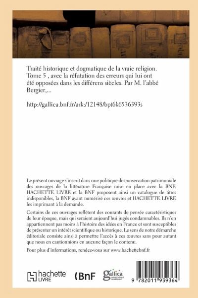 Traité historique et dogmatique de la vraie religion. Tome 5 /, avec la réfutation des erreurs qui lui ont été opposées dans les différens siècles. Par M. l'abbé Bergier, ... Date de l'édition originale: 1780 Le présent ouvrage s'inscrit dans une politique de conservation patrimoniale des ouvrages de la littérature Française mise en place avec la BNF. HACHETTE LIVRE et la BNF proposent ainsi un catalogue de titres indisponibles, la BNF ayant numérisé ces oeuvres et HACHETTE LIVRE les imprimant à la demande. Certains de ces ouvrages reflètent des courants de pensée caractéristiques de leur époque, mais qui seraient aujourd'hui jugés condamnables. Ils n'en appartiennent pas moins à l'histoire des idées en France et sont susceptibles de présenter un intérêt scientifique ou historique. Le sens de notre démarche éditoriale consiste ainsi à permettre l'accès à ces oeuvres sans pour autant que nous en cautionnions en aucune façon le contenu. Pour plus d'informations, rendez-vous sur www.hachettebnf.fr
