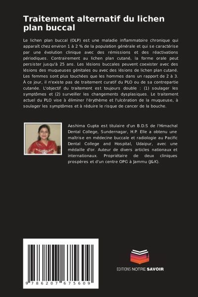Le lichen plan buccal (OLP) est une maladie inflammatoire chronique qui apparaît chez environ 1 à 2 % de la population générale et qui se caractérise par une évolution clinique avec des rémissions et des réactivations périodiques. Contrairement au lichen plan cutané, la forme orale peut persister jusqu'à 25 ans. Les lésions buccales peuvent coexister avec des lésions des muqueuses génitales ou avec des lésions de lichen plan cutané. Les femmes sont plus touchées que les hommes dans un rapport de 2 à 3. À ce jour, il n'existe pas de traitement curatif du PLO ou de sa contrepartie cutanée. L'objectif du traitement est toujours double : (1) soulager les symptômes et (2) surveiller les changements dysplasiques. Le traitement actuel du PLO vise à éliminer l'érythème et l'ulcération de la muqueuse, à soulager les symptômes et à réduire le risque de cancer de la bouche.