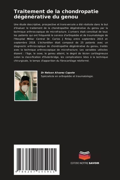 Une étude descriptive, prospective et transversale a été réalisée dans le but d'évaluer le traitement de la chondropathie dégénérative du genou par la technique arthroscopique de microfracture. L'univers était constitué de tous les patients qui ont fréquenté le service d'orthopédie et de traumatologie de l'Hospital Militar Central Dr. Carlos J Finlay entre septembre 2015 et septembre 2018. L'échantillon était composé de 25 patients avec un diagnostic arthroscopique de chondropathie dégénérative du genou, traités avec la technique arthroscopique de microfracture. Les variables utilisées étaient : l'âge, le sexe, le genou atteint, le degré de lésion cartilagineuse selon la classification d'Outerbridge, les complications liées à la technique chirurgicale, le temps d'apparition du fibrocartilage néoformé.