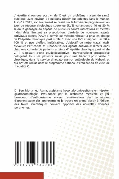 L'hépatite chronique post virale C est un problème majeur de santé publique, avec environ 71 millions d'individus infectés dans le monde. Jusqu' à 2011, son traitement se basait sur la bithérapie pégylée avec un taux de réponse virologique soutenue (RVS) variant entre 40 et 80 % selon le génotype au dépend de plusieurs contre-indications et d'effets indésirables limitant sa prescription. L'arrivée de nouveaux agents antiviraux directs (AAD) a permis de métamorphoser la prise en charge de l'hépatite chronique post virale C avec une RVS atteignant les 90 à 100 % et peu d'effets indésirables. L'objectif de notre travail était d'évaluer l'efficacité et l'innocuité des agents antiviraux directs dans chez une cohorte de patients atteints d'hépatite chronique post virale C. Il s'agissait d'une étude descriptive, transversale et prospective colligeant tous les patients suivis pour une hépatite post virale C chronique, dans le service d'hépato gastro- entérologie de Nabeul, et qui ont été inclus dans le programme national d'éradication de virus de l'hépatite C.