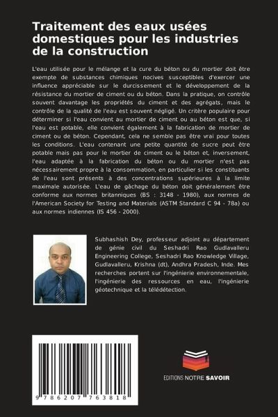 L'eau utilisée pour le mélange et la cure du béton ou du mortier doit être exempte de substances chimiques nocives susceptibles d'exercer une influence appréciable sur le durcissement et le développement de la résistance du mortier de ciment ou du béton. Dans la pratique, on contrôle souvent davantage les propriétés du ciment et des agrégats, mais le contrôle de la qualité de l'eau est souvent négligé. Un critère populaire pour déterminer si l'eau convient au mortier de ciment ou au béton est que, si l'eau est potable, elle convient également à la fabrication de mortier de ciment ou de béton. Cependant, cela ne semble pas être vrai pour toutes les conditions. L'eau contenant une petite quantité de sucre peut être potable mais pas pour le mortier de ciment ou le béton et, inversement, l'eau adaptée à la fabrication du béton ou du mortier n'est pas nécessairement propre à la consommation, en particulier si les constituants de l'eau sont présents à des concentrations supérieures à la limite maximale autorisée. L'eau de gâchage du béton doit généralement être conforme aux normes britanniques (BS : 3148 - 1980), aux normes de l'American Society for Testing and Materials (ASTM Standard C 94 - 78a) ou aux normes indiennes (IS 456 - 2000).