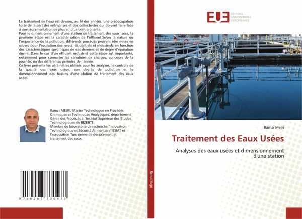 Le traitement de l'eau est devenu, au fil des années, une préoccupation forte de la part des entreprises et des collectivités qui doivent faire face à une réglementation de plus en plus contraignante.Pour le dimensionnement d'une station de traitement des eaux isées, la première étape est la caractérisation de l'effluent.Selon la nature ou l'importance de la pollution, différents procédés peuvent être mises en oeuvre pour l'épuration des rejets résidentiels et industriels en fonction des caractéristiques spécifiques de ces derniers et de degré d'épuration désiré. Dans le cas d'un effluent industriel cette étape est importante, notamment pour connaitre les variations de charges, au cours de la journée, ou des différentes périodes de l'année. Ce livre présente les paramètres utilisés pour les analyses, le controle de la qualité des eaux usées, son degrés de pollution et le dimensionnement des bassins d'une station de traitement des eaux usées.