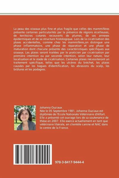 La peau des oiseaux plus fine et plus fragile que celles des mammifères présente certaines particularités par la présence de régions écailleuses, de territoires cutanés recouverts de plumes, de ses annexes épidermiques et de sa structure histologique. Lors de la cicatrisation des plaies accidentelles, comme chez les mammifères,on distingue une phase inflammatoire, une phase de réparation et une phase de maturation dont chacune présente des caractéristiques spécifiques aux oiseaux. Les plaies seront traitées par le praticien par cicatrisation par première intention ou par seconde intention, selon leur nature, leur localisation et le stade de cicatrisation. Certaines plaies nécessiteront un traitement spécifique, telles que les ulcères du bréchet, les plaies causées par les bagues d'identification, les abrasions du scalp, les brûlures et les podagres.