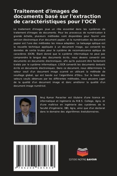 Le traitement d'images joue un rôle essentiel dans les systèmes de traitement d'images de documents. Pour les processus de numérisation à grande échelle, plusieurs méthodes sont disponibles pour fournir une version électronique d'un document papier, et la numérisation du document papier est l'une des méthodes les mieux adaptées. Le balayage optique est la nouvelle technique appliquée à un document image, qui convertit les données de sortie brutes pour le système de reconnaissance optique de caractères (OCR). Étant donné que le système informatique ne peut pas comprendre la langue des documents écrits, nous devons convertir ces documents en documents électroniques, afin qu'ils puissent être facilement traités par le système informatique. L'OCR convertit les documents textuels écrits en documents électroniques. Dans ce document, nous déterminons la valeur seuil d'un document image scanné en utilisant la méthode de seuillage global, qui est basée sur l'algorithme d'Otsu. Sur la base des valeurs seuils obtenues par les différentes méthodes, nous pouvons juger de la qualité d'un document image et donc améliorer la qualité d'un document image numérisé.