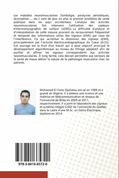 Les maladies neuromusculaires (lombalgie, paralysies périodiques, dystrophies..., etc.) sont de plus en plus le premier problème de santé publique dans les pays occidentaux. L'analyse des activités neuromusculaires fait intervenir l'utilisation des capteurs d'électromyographie de surface (sEMG). La difficulté d'analyse et d'interprétation de cette mesure provient du recouvrement fréquentiel et temporel des informations utiles des signaux sEMG par ceux de l'interférence. Ce qui accentue la distorsion des signaux sEMG, principalement par l'activité électrocardiographique du C ur (ECG). Cet ouvrage est le fruit d'un travail qui a pour objectif principal le développement algorithmique au niveau du filtrage adaptatif afin de purifier et affiner les signaux correspondants aux activités neuromusculaires. À long terme, cela devrait permettre aux secteurs de la santé de mieux définir la nature de la pathologie musculaire chez les patients.