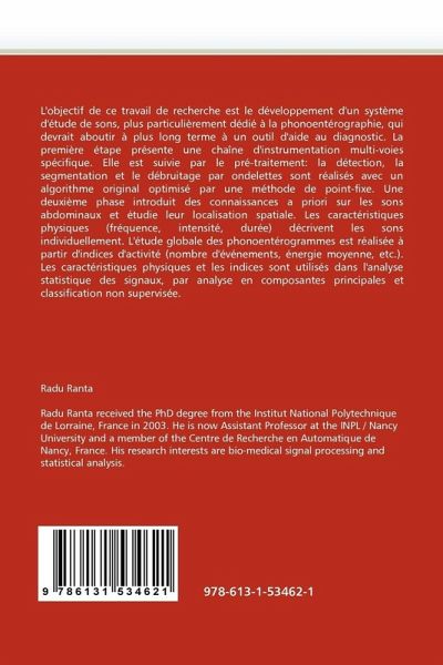 L'objectif de ce travail de recherche est le développement d'un système d'étude de sons, plus particulièrement dédié à la phonoentérographie, qui devrait aboutir à plus long terme à un outil d'aide au diagnostic. La première étape présente une chaîne d'instrumentation multi-voies spécifique. Elle est suivie par le pré-traitement: la détection, la segmentation et le débruitage par ondelettes sont réalisés avec un algorithme original optimisé par une méthode de point-fixe. Une deuxième phase introduit des connaissances a priori sur les sons abdominaux et étudie leur localisation spatiale. Les caractéristiques physiques (fréquence, intensité, durée) décrivent les sons individuellement. L'étude globale des phonoentérogrammes est réalisée à partir d'indices d'activité (nombre d'événements, énergie moyenne, etc.). Les caractéristiques physiques et les indices sont utilisés dans l'analyse statistique des signaux, par analyse en composantes principales et classification non supervisée.