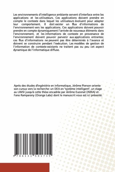 Les environnements d'intelligence ambiante servent d'interface entre les applications et les utilisateurs. Ces applications doivent prendre en compte le contexte dans lequel les utilisateurs évoluent pour adapter leur comportement. Il doit exister un ux d'informations de l'environnement vers les applications. Ces applications doivent pouvoir prendre en compte dynamiquement l'arrivée de nouveaux éléments dans l'environnement, et les informations de contexte en provenance de l'environnement doivent pouvoir parvenir aux applications entrantes; ces ux d'informations ne peuvent pas être déterminés à l'avance et doivent se construire pendant l'exécution. Les modèles de gestion de l'information de contexte existants ne traitent pas ou peu cet aspect dynamique de l'informatique diffuse.