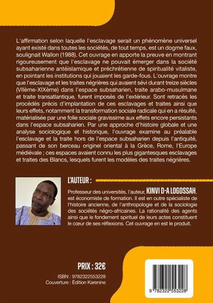 L'affirmation selon laquelle l'esclavage serait un phénomène universel ayant existé dans toutes les sociétés, de tout temps, est un dogme faux, soulignait Wallon (1988). Cet ouvrage en apporte la preuve en montrant rigoureusement que l'esclavage ne pouvait émerger dans la société subsaharienne antéislamique et préchrétienne de spiritualité vitaliste, en pointant les institutions qui jouaient les garde-fous. L'ouvrage montre que l'esclavage et les traites négrières qui avaient sévi durant treize siècles (VIIème-XIXème) dans l'espace subsaharien, traite arabo-musulmane et traite transatlantique, furent imposés de l'extérieur. Sont retracés les procédés précis d'implantation de ces esclavages et traites ainsi que leurs effets, notamment la transformation sociale radicale qui en a résulté, matérialisée par une folie sociale gravissime aux effets encore persistants dans l'espace subsaharien. Par une approche d'histoire globale et une analyse sociologique et historique, l'ouvrage examine au préalable l'esclavage et la traite hors de l'espace subsaharien depuis l'antiquité, passant de son berceau originel oriental à la Grèce, Rome, l'Europe médiévale ; ces espaces avaient connu les plus gigantesques esclavages et traites des Blancs, lesquels furent les modèles des traites négrières.