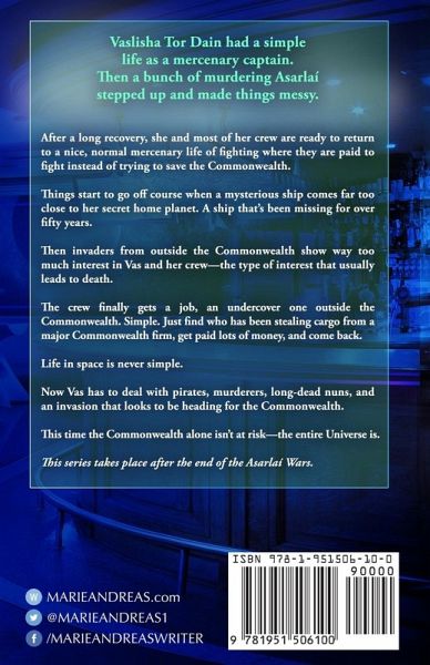 Vaslisha Tor Dain had a simple life as a mercenary captain. Then a bunch of murdering Asarlaí stepped up and made things messy. After a long recovery, she and most of her crew are ready to return to a nice, normal mercenary life of fighting where they are paid to fight instead of trying to save the Commonwealth. Things start to go off course when a mysterious ship comes far too close to her secret home planet. A ship that's been missing for over fifty years. Then invaders from outside the Commonwealth show way too much interest in Vas and her crew-the type of interest that leads to death. The crew finally gets a job, an undercover one outside the Commonwealth. Simple. Just find who has been stealing cargo from a major Commonwealth firm, get paid lots of money, and come back. Life in space is never simple. Now Vas has to deal with pirates, murderers, long dead nuns, and an invasion that looks to be heading for the Commonwealth. This time the Commonwealth alone isn't at risk-the entire Universe is.