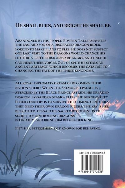 He Shall Burn, and Bright Shall He Be. Abandoned by his people, Edvern Tallermayne is the bastard son of a disgraced dragon rider. Forced to make plans to flee; he does not expect one last visit with the dragons will change his life forever. The dragons are angry, and only he can hear their voices. Out of spite he steals an ancient artefact, which becomes the catalyst to changing the fates of the three kingdoms. All royal diplomats dream of becoming their nation's hero. When the Saemorish palace is attacked by the Black Prince, astride his black dragon, Lyssandra Stamos flees the burning city. If her country is to survive the coming centuries, they need their own dragons riders. The key is her betrothed. It is said his sacred bloodline is the secret to controlling dragons. All she must do is find him and bring him before her king. Pity her betrothed isn't known for behaving ...