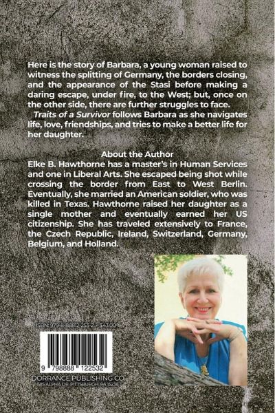 About the Book Here is the story of Barbara, a young woman raised to witness the splitting of Germany, the borders closing, and the appearance of the Stasi before making a daring escape, under fire, to the West; but, once on the other side, there are further struggles to face. Traits of a Survivor follows Barbara as she navigates life, love, friendships, and tries to make a better life for her daughter. About the Author Elke B. Hawthorne has a master's in Human Services and one in Liberal Arts. She escaped being shot while crossing the border from East to West Berlin. Eventually, she married an American soldier, who was killed in Texas. Hawthorne raised her daughter as a single mother and eventually earned her US citizenship. She has traveled extensively to France, the Czech Republic, Ireland, Switzerland, Germany, Belgium, and Holland.