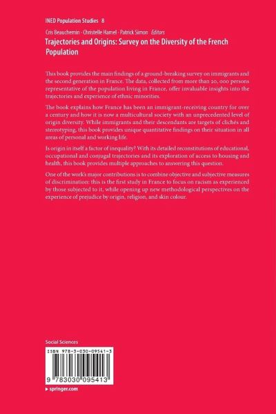 Preface.- 1: Introduction.- 2: Migration Histories and Socioeconomic Profiles: Cris Beauchemin, Bertrand Lhommeau, Patrick Simon .- 3: Educational Trajectories and Transition to Employment of the Second Generation: Jean-Luc Primon, Yael Brinbaum, Laure Moguérou.- 4: Employment and Wages of Immigrants and Descendants of Immigrants: Measures of Inequality and Perceived Discrimination:Dominique Meurs.- 5: Union Formation in a Multicultural Context: C. Hamel, B. Lhommeau, A. Pailhé, E. Santelli.- 6: The Living Environment of Immigrants and Their Descendants: Perceived Discrimination and Segregation: J.-L. Pan Ké Shon, C. Scodellaro.- 7: Migration and Living Conditions: Their Impact on Health: C. Hamel, M. Moisy.- 8: Discrimination in France: Between Perception and Experience: Y. Brinbaum, M. Safi, P. Simon.- 9: The place of Racism in the Study of Discrimination: C. Hamel, J.-L. Primon, M. Lesné.- 10: Language Use and Family Transmission in Migration Context: S. Condon, C. Régnard.-11: Registers of identity. The Relationships of Immigrants and their Descendants to French National Identity: P. Simon, V. Tiberj.- 12: Secularization or a Return to Religion? The Religiosity of Immigrants and their Descendants: P. Simon, V. Tiberj.- 13:Transnational Links and Integration: Between Here and There: C. Beauchemin, H. Lagrange, M. Safi.- Conclusion.- Methodological Appendix.
