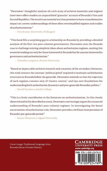 "Challenging assumptions regarding the strength and control of authoritarian governments in Rwanda in the decades before the 1994 genocide, Marie-Eve Desrosiers uses original archival data and interviews to highlight the complex relations between authorities, opponents, and society. Through careful, detailed analysis Desrosiers offers a nuanced assessment of the functions and evolution of authoritarianism over time, demonstrating how the governments of Rwanda's first two post-independence Republics (1962- 1990) sought and often struggled to cement their rule. Whilst the deeper, lived realities of authoritarianism are generally neglected by multicases comparisons at the heart of comparative authoritarian studies, this illuminating survey highlights the essential, yet subtle authoritarian strategies, patterns, and forms of decay that are too often overlooked when addressing authoritarian contexts"--