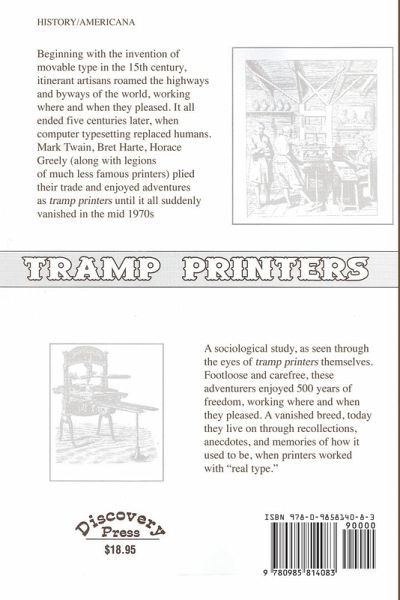Beginning with the invention of movable type in the 15th century, itinerant artisans roamed the highways and byways of the world, working where and when they pleased. It all ended five centuries later, when computer typesetting replaced humans. Mark Twain, Bret Harte, Horace Greely (along with legions of much less famous printers) plied their trade and enjoyed adventures as tramp printers until it all suddenly vanished in the mid 1970s. A sociological study, as seen through the eyes of tramp printers themselves. Footloose and carefree, these adventurers enjoyed 500 years of freedom, working where and when they pleased. A vanished breed, today they live on through recollections, anecdotes, and memories of how it used to be, when printers worked with "real type."