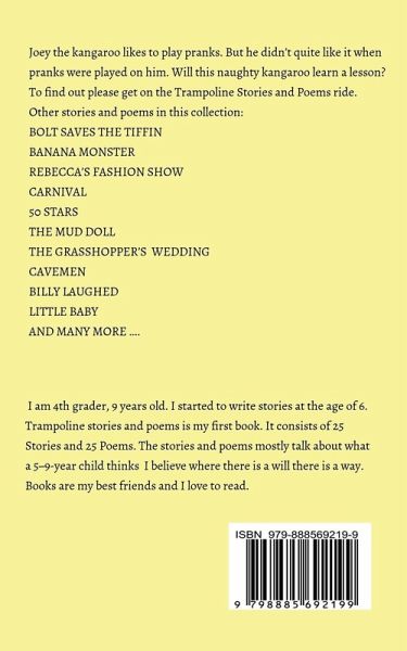 Stories and Poem for Children. Trampoline book volume 1 is a collection of 25 short stories and 25 poems for children of age 4 to 11 years. Meet Joy, Rebecca, Harry, The Yellow Bird, The Banana Monster and many more characters.