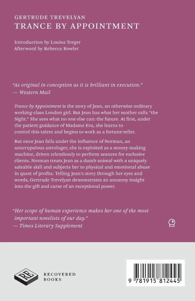 Trance by Appointment is the story of Jean, an otherwise ordinary working-class London girl with psychic powers. When she falls under the influence of an unscrupulous con man, she is exploited as a money-making machine. Through Jeanâ s voice, Gertrude Trevelyanâ s demonstrates an uncanny insight into the gift and curse of an exceptional power.