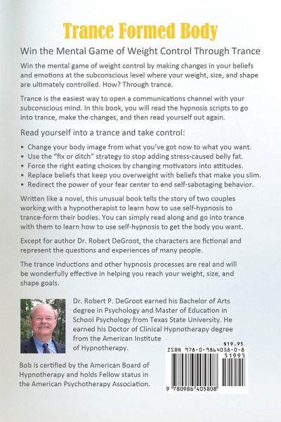Win the mental game of weight control by making changes in your beliefs and emotions at the subconscious level where your weight, size, and shape are ultimately controlled. How? Through hypnotic trance. Hypnotic trance is the easiest way to open a communications channel with your subconscious mind. In this book, you will read the hypnosis scripts to go into trance, make the changes, and then read yourself out again. Read yourself into a hypnotic trance and take control: • Change your body image from what you’ve got now to what you want. • Use the "fix or ditch" strategy to stop adding stress-caused belly fat. • Force the right eating choices by changing motivators into attitudes. • Replace beliefs that keep you overweight with beliefs that make you slim. • Redirect the power of your fear center to end self-sabotaging behavior. Written like a novel, this unusual book tells the story of two couples working with a hypnotherapist to learn how to use self-hypnosis to trance-form their bodies. You can simply read along and go into trance with them to learn how to use self-hypnosis to get the body you want. Except for author Dr. Robert DeGroot, the characters are fictional and represent the questions and experiences of many people. The trance inductions and other hypnosis processes are real and will be wonderfully effective in helping you reach your weight, size, and shape goals.