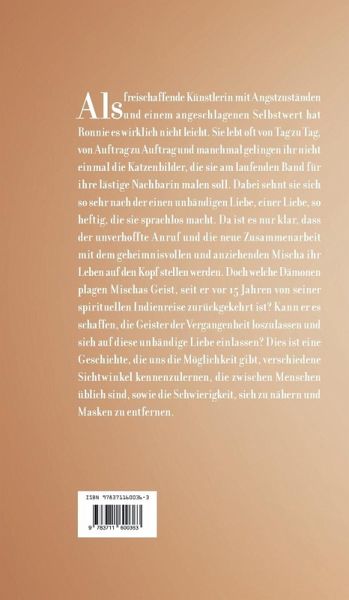 Als freischaffende Künstlerin mit Angstzuständen und einem angeschlagenen Selbstwert hat Ronnie es wirklich nicht leicht. Sie lebt oft von Tag zu Tag, von Auftrag zu Auftrag und manchmal gelingen ihr nicht einmal die Katzenbilder, die sie am laufenden Band für ihre lästige Nachbarin malen soll. Dabei sehnt sie sich so sehr nach der einen unbändigen Liebe, einer Liebe, so heftig, die sie sprachlos macht. Da ist es nur klar, dass der unverhoffte Anruf und die neue Zusammenarbeit mit dem geheimnisvollen und anziehenden Mischa ihr Leben auf den Kopf stellen werden. Doch welche Dämonen plagen Mischas Geist, seit er vor 15 Jahren von seiner spirituellen Indienreise zurückgekehrt ist? Kann er es schaffen, die Geister der Vergangenheit loszulassen und sich auf diese unbändige Liebe einlassen? Dies ist eine Geschichte, die uns die Möglichkeit gibt, verschiedene Sichtwinkel kennenzulernen, die zwischen Menschen üblich sind, sowie die Schwierigkeit, sich zu nähern und Masken zu entfernen.