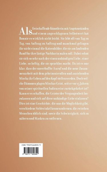 Als freischaffende Künstlerin mit Angstzuständen und einem angeschlagenen Selbstwert hat Ronnie es wirklich nicht leicht. Sie lebt oft von Tag zu Tag, von Auftrag zu Auftrag und manchmal gelingen ihr nicht einmal die Katzenbilder, die sie am laufenden Band für ihre lästige Nachbarin malen soll. Dabei sehnt sie sich so sehr nach der einen unbändigen Liebe, einer Liebe, so heftig, die sie sprachlos macht. Da ist es nur klar, dass der unverhoffte Anruf und die neue Zusammenarbeit mit dem geheimnisvollen und anziehenden Mischa ihr Leben auf den Kopf stellen werden. Doch welche Dämonen plagen Mischas Geist, seit er vor 15 Jahren von seiner spirituellen Indienreise zurückgekehrt ist? Kann er es schaffen, die Geister der Vergangenheit loszulassen und sich auf diese unbändige Liebe einlassen? Dies ist eine Geschichte, die uns die Möglichkeit gibt, verschiedene Sichtwinkel kennenzulernen, die zwischen Menschen üblich sind, sowie die Schwierigkeit, sich zu nähern und Masken zu entfernen.