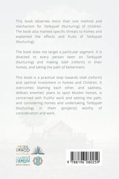 This book (Tranquil Homes: How to Nurture Our Homes as a mainstay of Serenity - Deliberations around developing and upbringing families, and the challenges they face) observes more than one method and mechanism for Tarbiyyah (Nurturing) of children. The book also marked specific threats to homes and explained the effects and fruits of Tarbiyyah (Nurturing). The book does not target a particular segment. It is directed to every person keen on Tarbiyyah (Nurturing) and making Islah (reform) in their homes, and taking the path of betterment. This book is a practical step towards Islah (reform) and optimal investment in homes and Children. It overcomes blaming each other, and sadness, defeats enemies' plans to spoil Muslim homes, is concerned with fruitful work and setting the path, and considering homes and undertaking Tarbiyyah (Nurturing) in them (projects) worthy of consideration and work.