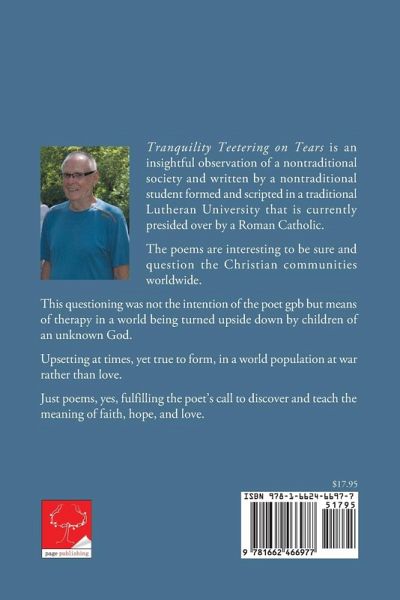 Tranquility Teetering on Tears is an insightful observation of a nontraditional society and written by a nontraditional student formed and scripted in a traditional Lutheran University that is currently presided over by a Roman Catholic. The poems are interesting to be sure and question the Christian communities worldwide. This questioning was not the intention of the poet gpb but means of therapy in a world being turned upside down by children of an unknown God. Upsetting at times, yet true to form, in a world population at war rather than love. Just poems, yes, fulfilling the poet's call to discover and teach the meaning of faith, hope, and love.