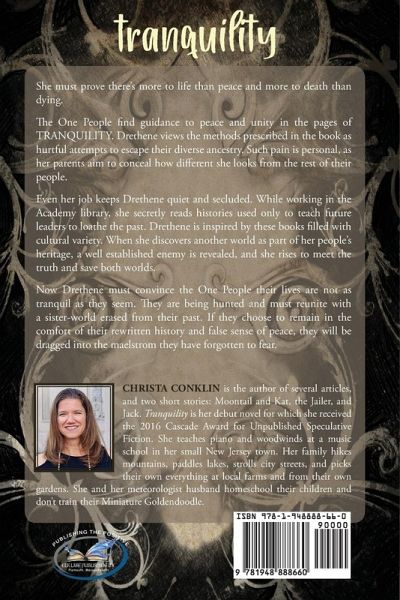 Christa Conklin is the author of several articles, and two short stories: "Moontail" and "Kat, the Jailer, and Jack." Tranquility is her debut novel for which she received the 2016 Cascade Award for Unpublished Speculative Fiction. Fantasy is her favorite genre to read and write. She spent her childhood wrinkling time in Narnia, Prydain, and Middle Earth. Adulthood found her old enough to read fairy tales again and to create new worlds to better understand ours. When she's not fashioning creatures and developing nations, Christa teaches piano and woodwinds at a music school in her small New Jersey town. She and her family hike mountains, paddle lakes, stroll city streets, and pick their own everything at local farms and from their own gardens. Prior to parenthood, she studied in France, earned a couple of degrees, worked in Manhattan for the New York Philharmonic, in Princeton for Young Audiences New Jersey, and once took first place in a women's solo kayak river race. She loves to travel and returns often to the Adirondack Mountains from which she drew inspiration for the creation of Tranquility. She and her meteorologist husband homeschool their children, creating a happy environment for their miniature Goldendoodle, who spends his days sleeping on laps created by learning and writing. Visit her at christaconklin. com.
