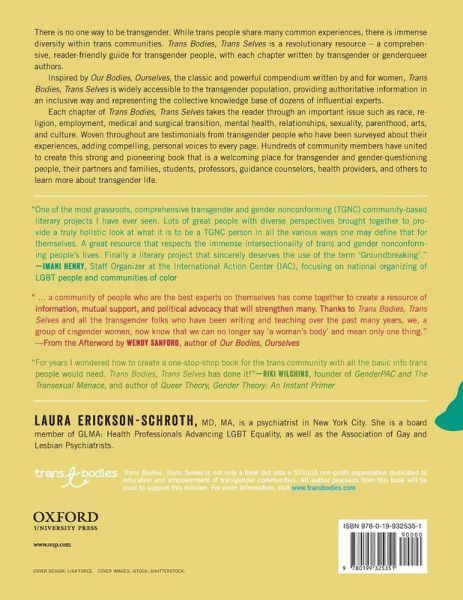 Trans Bodies, Trans Selves is a groundbreaking, personal, and informative guide for the transgender population, covering health, legal issues, cultural and social questions, history, theory, and more. It is a place for transgender and gender-questioning people, their partners and families, students, professors, and guidance counselors, to look for up-to-date information on transgender life.