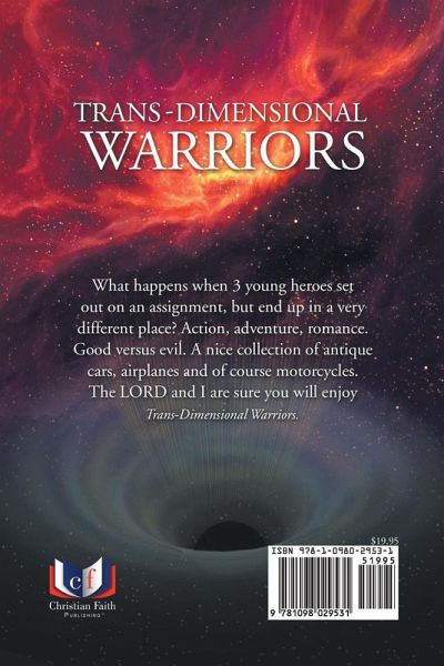 What happens when 3 young heroes set out on an assignment, but end up in a very different place? Action, adventure, romance. Good versus evil. A nice collection of antique cars, airplanes and of course motorcycles. The LORD and I are sure you will enjoy Trans-Dimensional Warriors.