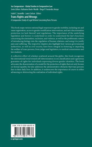 Introduction.- The stakes in sex: obstacles and opportunities in legal reform for trans persons.- X' Why? Gender Markers and Non-Binary Transgender People. PART I: The strong medicalization model.- Gender Identity and the LGBT Movement in Brazil.- The Legal Status of Transsexual and Transgender Persons in the Republic of Croatia.- The Civil Status of Trans Persons in the Czech Republic.- Reassignment (change) of sex in Poland - the case law phenomenon in a civil law country.- Conditions for the Recognition of the Civil Status of Transsexual and Transgender Persons under the Romanian Legal System.- Gender Identity, National Identity and the Right of Self- Determination ~A Peculiar Case of Taiwan.- Conditions Of The Recognition Of The Civil Status Of Transsexual And Transgender Persons In Turkey.- PART II: The soft medicalization model.- Conditions of the recognition of the civil status of transsexual and transgender persons in Austria.- Trans persons in Belgium.- The Civil Status of Transgender and Transsexual Persons in England.- Trans rights in Germany.- The protection of trans rights in Israel.- PART III: Self- determination in the registration of sex.- Argentina, transgender and the development of a human rights discourse.- La Reconnaissance Des Droits Des Personnes Trans Au Canada .- Gender Identity, Human Dignity and Self-Determination in Chile.- The recognition of sexual identity as a source of harm in Colombian Constitutional Law.- Conditions of the recognition of the civil status of transsexual and transgender people Denmark.- The Recognition of the Civil Status of Transgender People in Greece.- The Law Concerning Transgender and Transsexual Persons in Ireland.- Recognition of the civil status of transgender people in Norwegian law .- The Paradox of Transgender Law in Sweden.- Perspectives on History, Medicine, Law, andRegulations for Transgender Persons in the United States.