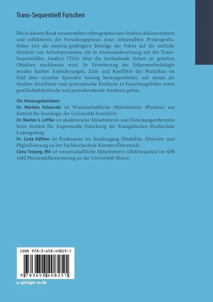 Das Forschungsprogramm der Trans-Sequentiellen Analyse.- Follow the People Following the(ir) Things. Zur Formierung transsequentieller Fälle im Feld und am Desk.- In Relation und Resonanzweite - Wie das Schreiben von Verträgen trans-sequentiell organisiert wird.- Über das Entscheiden in Bauverwaltungen - Wie wird eine administrative Entscheidung entscheidbar?.- Regierungstechnologien bei Lichte betrachten Gouvernementalitätsstudien meet TSA.- A Trans-Sequential Analysis of Broadcast Journalism.- Digital Objects? Materialities in the Trans-Sequential Analysis of Digital Work.- Schritt für Schritt plastikfrei - Trans-sequentielle Analyse und Innovationsforschung.- Wenn sich die Ausreisepflicht sträubt: die diametrale Arbeit an formativem Objekt und Gegenobjekt.- Gegen den Strich - Die TSA an der Schnittstelle zur Bewegungs- und Transformationsforschung.- Work in/on Process - Eine Diskussion über Forschungspraxis der Trans-Sequentiellen Analyse.