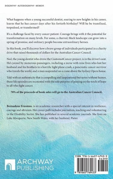 What happens when a young successful dentist, soaring to new heights in his career, learns that he has cancer days after his fortieth birthday? Will he be transfixed, torpedoed, or transformed? It's a challenge faced by every cancer patient. Courage brings with it the potential for transformation on many levels. For some, a charred, black landscape can grow into a spring of promise, and ordinary people become extraordinary heroes. In this book, you'll discover how a brave group of individuals participated in a charity drive that raised thousands of dollars for the Australian Cancer Council. Ned, the young dentist who drove the Customs4Cancer project, is in the driver's seat. He's joined by numerous passengers, including a nurse with nine lives who lost her husband and his brothers in a horrific light plane crash, a pancreatic cancer survivor who travels the world, and a man suspended on a crane above the Sydney Opera house. Told with an authenticity that is compelling and inspirational but never without humor, these life episodes are recounted with the sole purpose of passing on the torch of hope to all who fight cancer. 70% of the proceeds of book sales will go to the Australian Cancer Council.