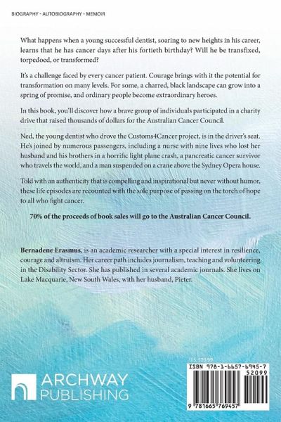 What happens when a young successful dentist, soaring to new heights in his career, learns that he has cancer days after his fortieth birthday? Will he be transfixed, torpedoed, or transformed? It's a challenge faced by every cancer patient. Courage brings with it the potential for transformation on many levels. For some, a charred, black landscape can grow into a spring of promise, and ordinary people become extraordinary heroes. In this book, you'll discover how a brave group of individuals participated in a charity drive that raised thousands of dollars for the Australian Cancer Council. Ned, the young dentist who drove the Customs4Cancer project, is in the driver's seat. He's joined by numerous passengers, including a nurse with nine lives who lost her husband and his brothers in a horrific light plane crash, a pancreatic cancer survivor who travels the world, and a man suspended on a crane above the Sydney Opera house. Told with an authenticity that is compelling and inspirational but never without humor, these life episodes are recounted with the sole purpose of passing on the torch of hope to all who fight cancer. 70% of the proceeds of book sales will go to the Australian Cancer Council.