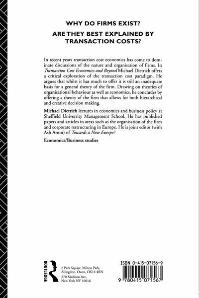 In recent years transaction costs economics have come to dominate the discussion of the nature and organization of firms. In Transaction Costs Economics and Beyond Michael Driscoll offers a critical exploration of transaction costs. He argues that whilst they have much to offer they are still an inadequate basis for a general theory of the firm. Drawing on theories of organizational behaviour as well as economics, he concludes by offering a theory of the firm that allows for both hierarchical and creative decision making.