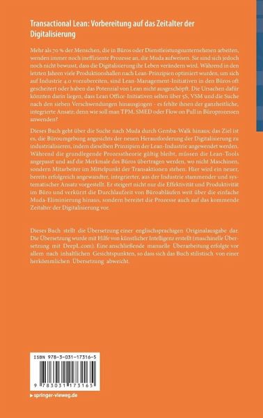 Dieses Buch geht über die Suche nach Muda durch Gemba-Walk hinaus: das Ziel ist es, die Büroumgebung angesichts der neuen Herausforderung der Digitalisierung zu industrialisieren, indem dieselben Prinzipien der Lean-Industrie angewendet werden. Während die grundlegende Prozesstheorie gültig bleibt, müssen die Lean-Tools angepasst und auf die Merkmale des Büros übertragen werden, wo nicht Maschinen, sondern Mitarbeiter im Mittelpunkt der Transaktionen stehen. Hier wird ein neuer, bereits erfolgreich angewandter, integrierter, aus der Industrie stammender und systematischer Ansatz vorgestellt. Er steigert nicht nur die Effektivität und Produktivität im Büro und verkürzt die Durchlaufzeit von Büroabläufen weit über die einfache Muda-Eliminierung hinaus, sondern bereitet die Prozesse auch auf das kommende Zeitalter der Digitalisierung vor.