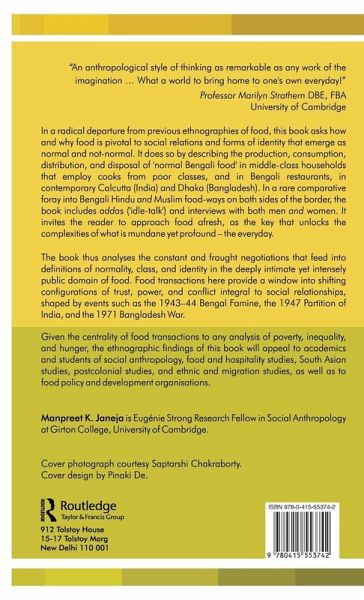 The book aims to generate a new theoretical focus on the anthropology of food, everyday life and material culture through a comparative ethnography of culinary practices of Bengali Hindu and Muslim poor and middle classes on either side of the Bengal international border - Calcutta and Dhaka. It seeks to unravel the constant fraught negotiations of social relations of 'normality', class, identity as well as perceived inequities in the cultural economies of food vis-a-vis production, consumption, exchange and ownership.