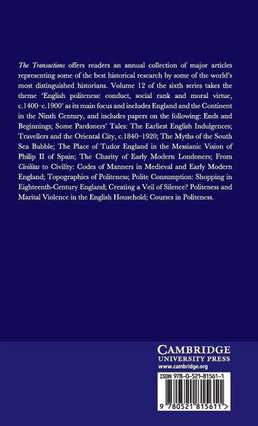 The Transactions offers readers an annual collection of major articles representing some of the best historical research by some of the world's most distinguished historians. Volume 12 of the sixth series takes the theme 'English politeness: conduct, social rank and moral virtue, c.1400¿c.1900' as its main focus and includes England and the Continent in the Ninth Century, and includes papers on the following: Ends and Beginnings; Some Pardoners' Tales: The Earliest English Indulgences; Travellers and the Oriental City, c.1840¿1920; The Myths of the South Sea Bubble; The Place of Tudor England in the Messianic Vision of Philip II of Spain; The Charity of Early Modern Londoners; From Civilitas to Civility: Codes of Manners in Medieval and Early Modern England; Topographies of Politeness; Polite Consumption: Shopping in Eighteenth-Century England; Creating a Veil of Silence? Politeness and Marital Violence in the English Household; Courses in Politeness.