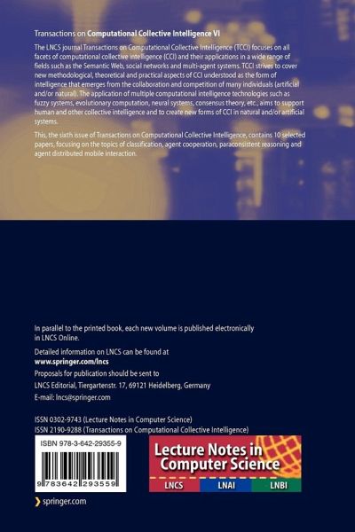 These Transactions publish research in computer-based methods of computational collective intelligence (CCI) and their applications in a wide range of fields such as the Semantic Web, social networks and multiagent systems. TCCI strives to cover new methodological, theoretical and practical aspects of CCI understood as the form of intelligence that emerges from the collaboration and competition of many individuals (artificial and/or natural). The application of multiple computational intelligence technologies such as fuzzy systems, evolutionary computation, neural systems, consensus theory, etc., aims to support human and other collective intelligence and to create new forms of CCI in natural and/or artificial systems.