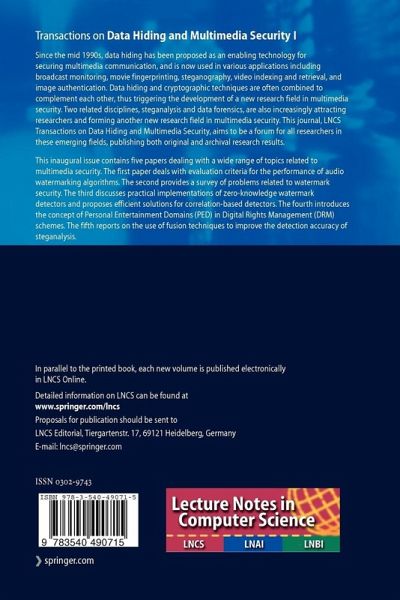 Since the mid 1990s, data hiding has been proposed as an enabling technology for securing multimedia communication, and is now used in various applications including broadcast monitoring, movie fingerprinting, steganography, video indexing and retrieval, and image authentication. Data hiding and cryptographic techniques are often combined to complement each other, thus triggering the development of a new research field in multimedia security. Two related disciplines, steganalysis and data forensics, are also increasingly attracting researchers and forming another new research field in multimedia security. This journal, LNCS Transactions on Data Hiding and Multimedia Security, aims to be a forum for all researchers in these emerging fields, publishing both original and archival research results.