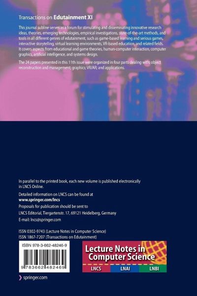 This journal subline serves as a forum for stimulating and disseminating innovative research ideas, theories, emerging technologies, empirical investigations, state-of-the-art methods, and tools in all different genres of edutainment, such as game-based learning and serious games, interactive storytelling, virtual learning environments, VR-based education, and related fields. It covers aspects from educational and game theories, human-computer interaction, computer graphics, artificial intelligence, and systems design.The 24 papers presented in this 11th issue were organized in four parts dealing with: object reconstruction and management; graphics; VR/AR; and applications.