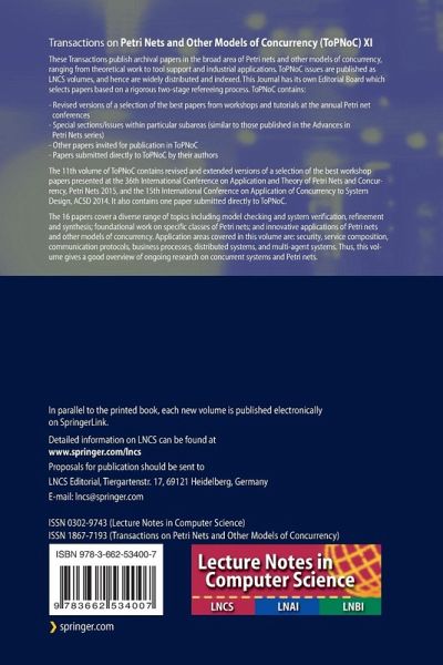 The 16 papers cover a diverse range of topics including model checking and system verification, refinement and synthesis; foundational work on specific classes of Petri nets; and innovative applications of Petri nets and other models of concurrency. Application areas covered in this volume are: security, service composition, communication protocols, business processes, distributed systems, and multi-agent systems. Thus, this volume gives a good overview of ongoing research on concurrent systems and Petri nets.