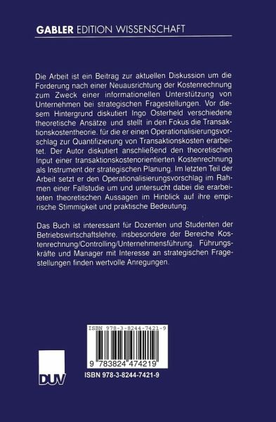 Ingo Osterheld untersucht - als Beitrag zur Diskussion um die Neuausrichtung der Kostenrechnung - theoretisch und empirisch das Potential einer Transaktionskostenrechnung im Hinblick auf die informationelle Unterstützung strategischer Fragestellungen.