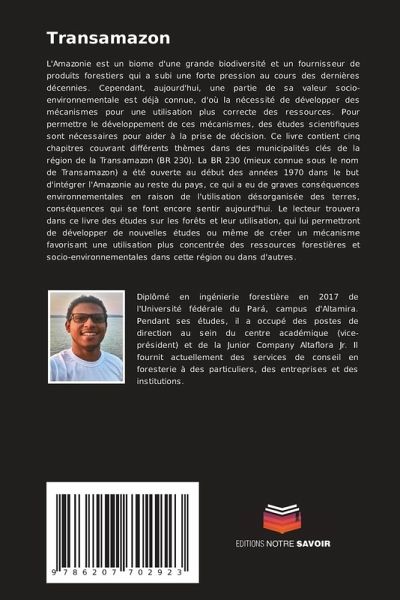 L'Amazonie est un biome d'une grande biodiversité et un fournisseur de produits forestiers qui a subi une forte pression au cours des dernières décennies. Cependant, aujourd'hui, une partie de sa valeur socio-environnementale est déjà connue, d'où la nécessité de développer des mécanismes pour une utilisation plus correcte des ressources. Pour permettre le développement de ces mécanismes, des études scientifiques sont nécessaires pour aider à la prise de décision. Ce livre contient cinq chapitres couvrant différents thèmes dans des municipalités clés de la région de la Transamazon (BR 230). La BR 230 (mieux connue sous le nom de Transamazon) a été ouverte au début des années 1970 dans le but d'intégrer l'Amazonie au reste du pays, ce qui a eu de graves conséquences environnementales en raison de l'utilisation désorganisée des terres, conséquences qui se font encore sentir aujourd'hui. Le lecteur trouvera dans ce livre des études sur les forêts et leur utilisation, qui lui permettront de développer de nouvelles études ou même de créer un mécanisme favorisant une utilisation plus concentrée des ressources forestières et socio-environnementales dans cette région ou dans d'autres.