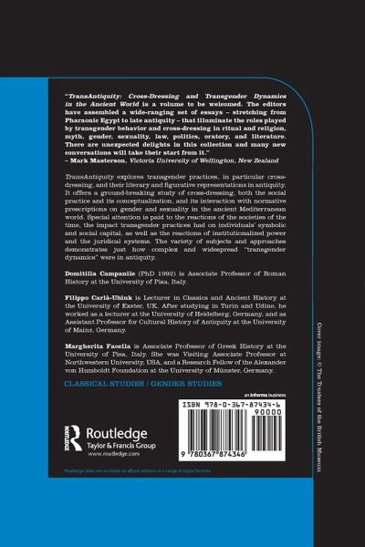 TransAntiquity explores transgender practices, in particular cross-dressing, and their literary and figurative representations in antiquity. It offers a ground-breaking study of cross-dressing, both the social practice and its conceptualization, and its interaction with normative prescriptions on gender and sexuality in the ancient Mediterranean world. Special attention is paid to the reactions of the societies of the time, the impact transgender practices had on individuals' symbolic and social capital, as well as the reactions of institutionalized power and the juridical systems. The variety of subjects and approaches demonstrates just how complex and widespread "transgender dynamics" were in antiquity.