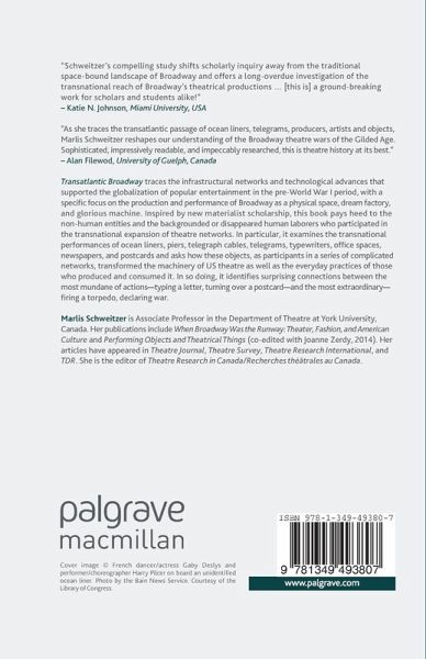 "Transatlantic Broadway makes an important contribution to theatre and performance studies, American cultural history, histories of capitalism, and studies of print and material culture. ... Essential for scholars and teachers of theatre history, Schweitzer's study prompts readers to envision historiography as competing and overlapping threads or networks. ... Transatlantic Broadway attends to performers, spaces, and archives that have been neglected in previous studies of the theatre, thus encouraging scholars to rethink the literal and disciplinary borders of US theatre history." (Nicole Berkin, Theatre Survey, Vol. 58 (1), January, 2017)