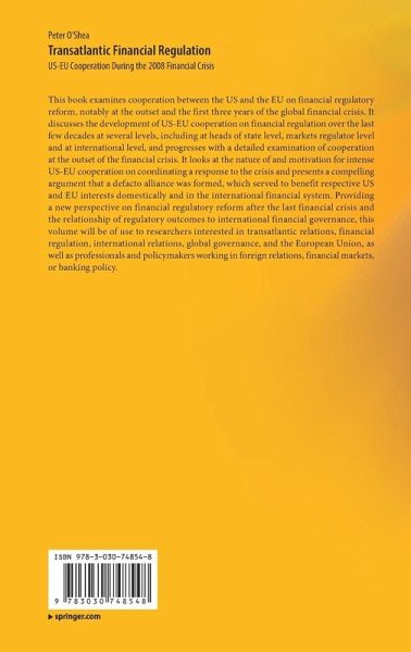 This book examines cooperation between the US and the EU on financial regulatory reform, notably at the outset and the first three years of the global financial crisis. It discusses the development of US-EU cooperation on financial regulation over the last few decades at several levels, including at heads of state level, markets regulator level and at international level, and progresses with a detailed examination of cooperation at the outset of the financial crisis. It looks at the nature of and motivation for intense US-EU cooperation on coordinating a response to the crisis and presents a compelling argument that a defacto alliance was formed, which served to benefit respective US and EU interests domestically and in the international financial system. Providing a new perspective on financial regulatory reform after the last financial crisis and the relationship of regulatory outcomes to international financial governance, this volume will be of use to researchers interested in transatlantic relations, financial regulation, international relations, global governance, and the European Union, as well as professionals and policymakers working in foreign relations, financial markets, or banking policy.