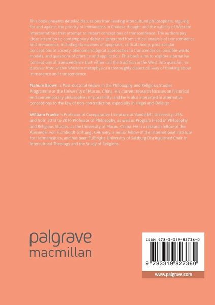 Preface, William Franke.- 1. Introduction, Nahum Brown.- Part I:- 2. 1. Getting Past Transcendence: Determinacy, Indeterminacy, and Emergence in Chinese Natural Cosmology, Roger T. Ames.- 3. 2. Classical Chinese Thought and the Sense of Transcendence, William Franke.- 4. 3. Equivocations of "Transcendence": Responses to Roger Ames, William Franke.- 5. 4. Transcendence, Immanence and Creation: A Comparative Study of Christian and Daoist Thoughts with Special Reference to Robert Neville, Yonghua Ge.- 6. 5. Immanent Transcendence in the Chinese Tradition - Thoughts about a Chinese Controversy, Karl-Heinz Pohl.- 7. 6. Emptiness of Transcendence - The Inconceivable and Invisible in Chinese Buddhist Thought, Hans-Rudolf Kantor.- Part II:- 8. 7. Idiot Wisdom and the Intimate Universal: On Immanence and Transcendence in an Intercultural Perspective, William Desmond.- 9. 8. Transcendent and Immanent Conceptions of Perfection in Leibniz and Hegel, Nahum Brown.- 10. 9. An Exemplary Operation - Articulating the Practice of Shikantaza via Deleuze, Antonia Pont.- 11. 10. Future as Transcendence: On a Central Problem in Ernst Bloch's Philosophy of Religion, Michael Eckert.- 12. 11. Postsecularism and the Fate of Transcendence, Mario Wenning.- 13. 12. Who is Engaged in the "Complicity with Power"? On the Difficulties Sinology has with Dissent and Transcendence, Heiner Roetz.
