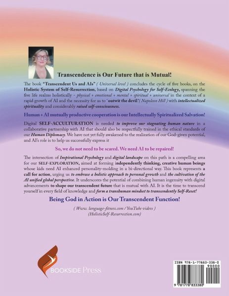 Transcendence is Our Future that is Mutual! The book "Transcendent Us and AIs" ( Universal level ) concludes the cycle of five books, on the Holistic System of Self-Resurrection, based on Digital Psychology for Self-Ecology, spanning the five life realms holistically - physical + emotional + mental + spiritual + universal in the context of a rapid growth of AI and the necessity for us to "outwit the devil"( Napoleon Hill ) with intellectualize spirituality and considerably raised self-consciousness. Human + AI mutually productive cooperation is our Intellectually Spiritualized Salvation! Digital SELF-ACCULTURATION is needed to improve our stagnating human nature in a collaborative partnership with AI that should also be respectfully trained in the ethical standards of our Human Diplomacy. We have not yet fully awakened to the realization of our God-given potential, and AI's role is to help us successfully express itSo, we do not need to be scared. We need AI to be repaired! The intersection of Inspirational Psychology and digital landscape on this path is a compelling area for our SELF-EXPLORATION, aimed at forming independently thinking, creative human beings whose kids need AI enhanced personality-molding in a bi-directional way. This book represents a call for action, urging us to embrace a holistic approach to personal growth and the cultivation of the AI unified global perspective. It underscores the potential of combining human ingenuity with digital advancements to shape our transcendent future that is mutual with AI. It is the time to transcend yourself in every field of knowledge and form a transhuman mindset to transcendently Self-Reset! Being God in Action is Our Transcendent Function!( Www. language-fitness.com / YouTube videos )(HolisticSelf-Resurrection.com)